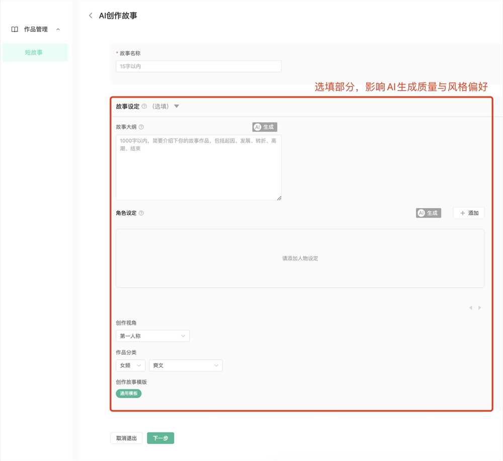 - 故事大纲:1000字以内,整体简要介绍下你的故事作品,包括起因、发展、转折、高潮和结束。可手动输入或者点击右上角【AI生成】